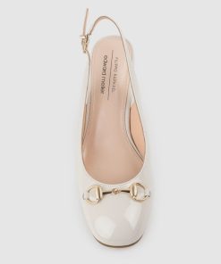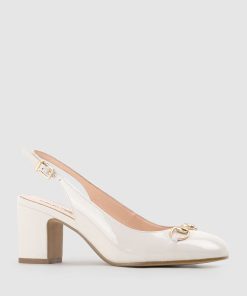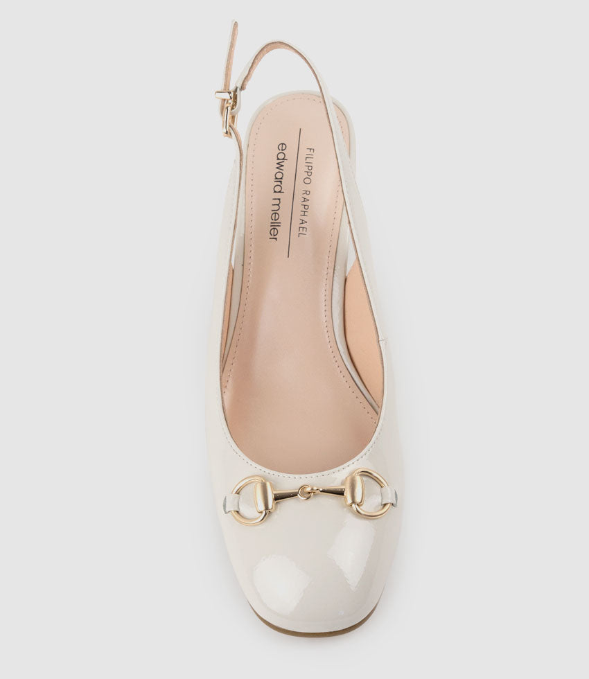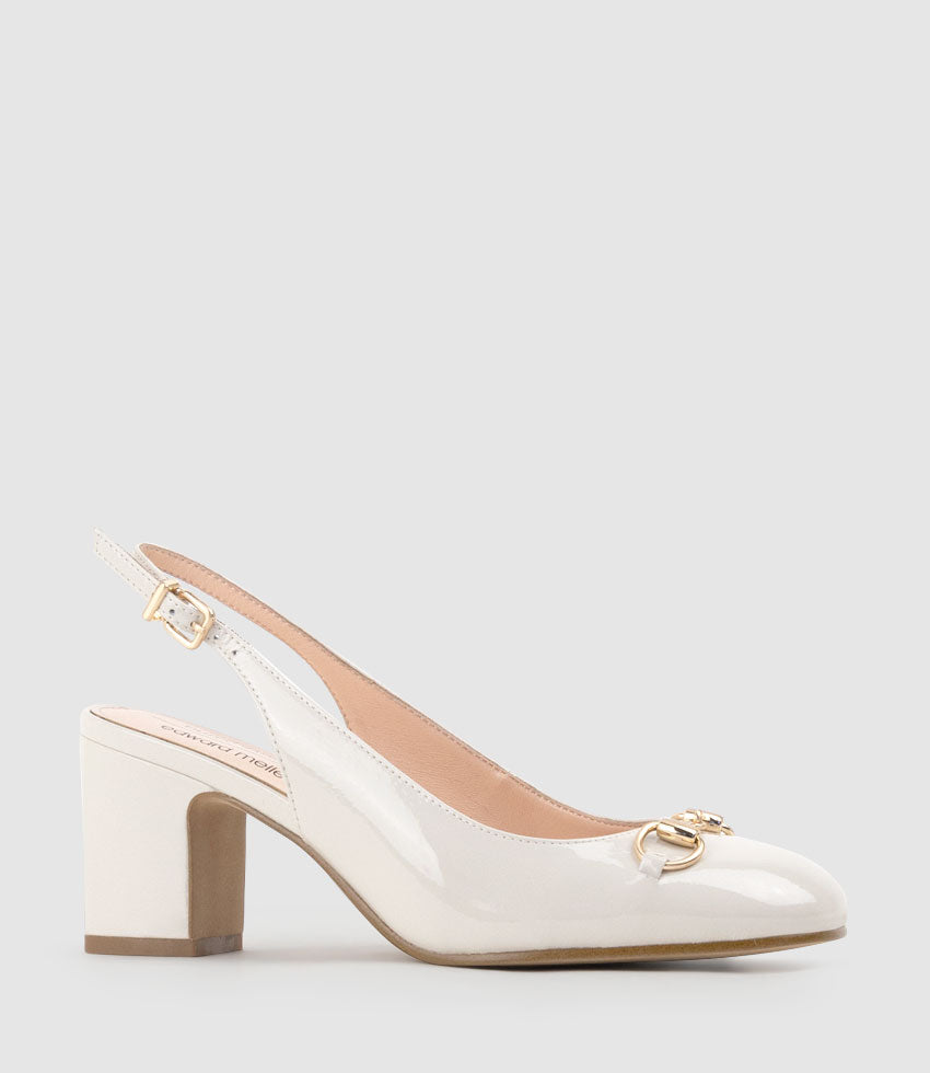 The CAMILLE65 slingback pump by Filippo Raphael for Edward Meller is a refined addition to any wardrobe. Crafted from glossy patent leather, this mid-heel style features squared-off toes adorned with timeless horse-bit hardware. A 65mm block heel ensures stability and all-day comfort, while the lightly cushioned insoles make it a practical yet elegant choice for both workdays and special occasions.