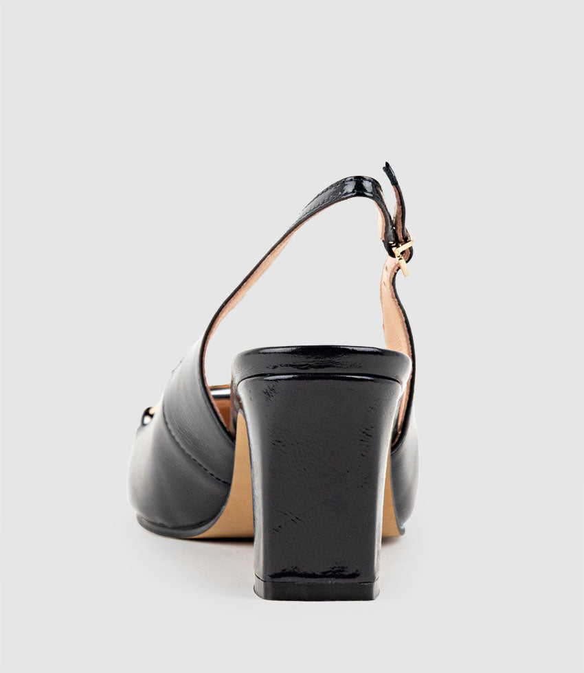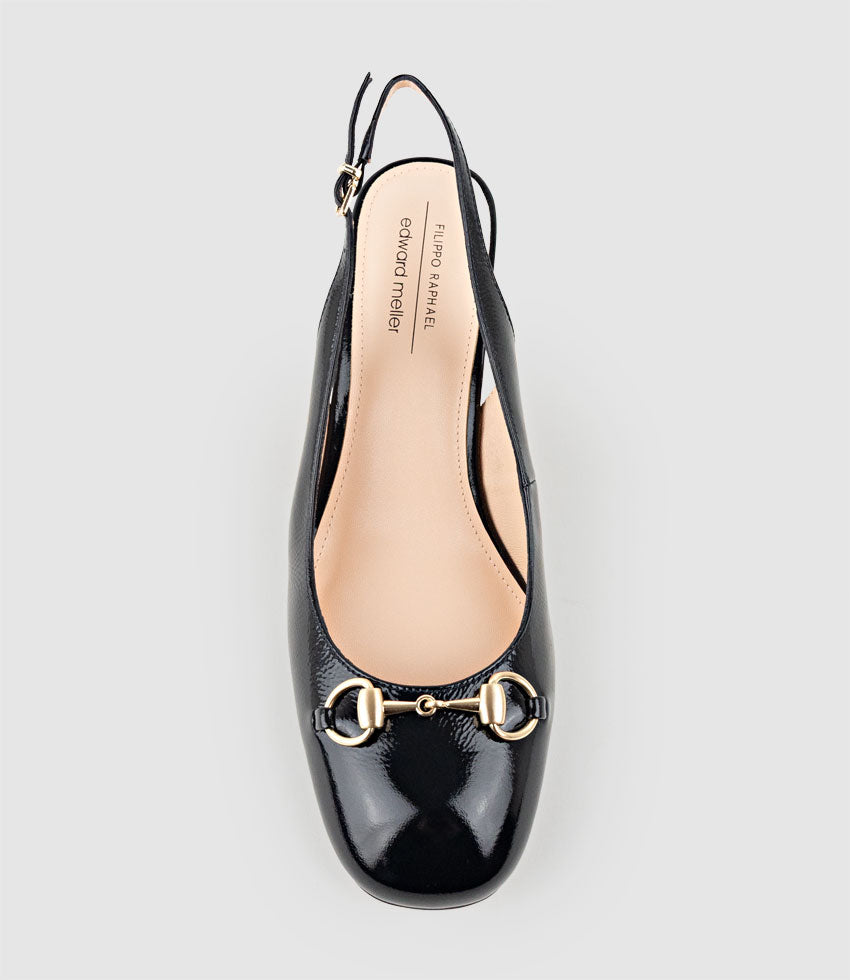 The CAMILLE65 slingback pump by Filippo Raphael for Edward Meller is a refined addition to any wardrobe. Crafted from glossy patent leather, this mid-heel style features squared-off toes adorned with timeless horse-bit hardware. A 65mm block heel ensures stability and all-day comfort, while the lightly cushioned insoles make it a practical yet elegant choice for both workdays and special occasions.