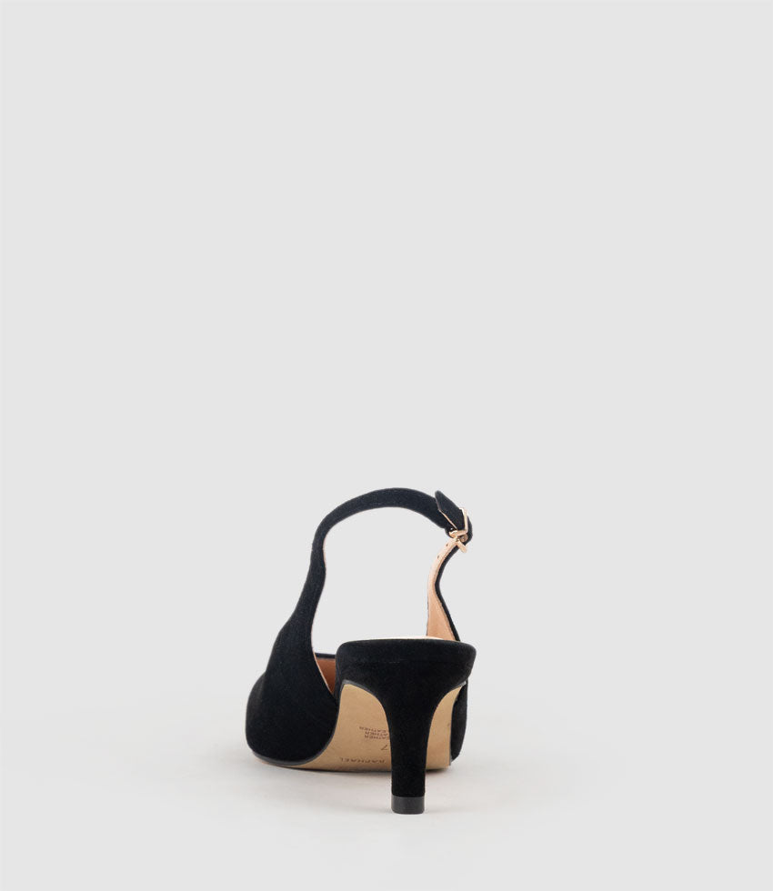 The DAMA55 pump by Filippo Raphael for Edward Meller offers a perfect blend of elegance and versatility. This style is designed with a sleek pointed toe and a refined 55 mm kitten heel, which adds a sophisticated touch to any look. The slingback strap with an adjustable buckle ensures a secure and comfortable fit, while the cushioned leather insoles provide lasting comfort. The DAMA55 is a timeless addition to your wardrobe, ideal for both workdays and special occasions.