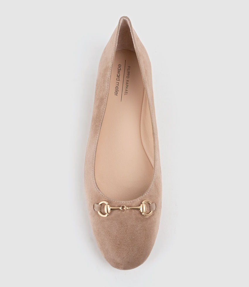 The FRIA ballet flat by Filippo Raphael for Edward Meller is a refined choice for effortless style. Designed with a flexible upper and a classic round toe adorned with horse-bit hardware, this flat is both chic and versatile. A cushioned insole and full leather lining provide lasting comfort and breathability, making it perfect for all-day wear.
