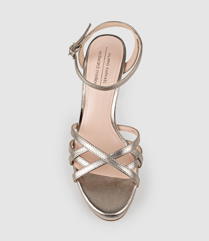 The SAMI110 from the Platinum Collection by Filippo Raphael for Edward Meller is a striking platform sandal that combines height with elegance. Featuring a 110-mm heel balanced by a sturdy platform, these sandals are designed for both style and comfort. The elegant lattice front adds a sophisticated touch, while the delicate ankle strap ensures a secure fit. Perfect for making a statement at any event.